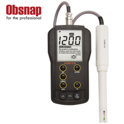 The affordable, water-resistant HI9813-5 portable meter monitors temperature, conductivity (EC), pH, and total dissolved solids (TDS) with a single probe. With specific buttons for measurement modes to be presented on the LCD and knobs for single point pH and EC/TDS calibration, the meter’s operation is made simpler.