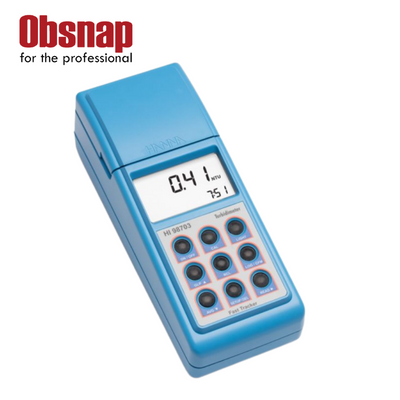 | Ordering Information | HI98703 is supplied with sample cuvettes and caps (5), HI98703-11 calibration cuvettes, silicone oil, cuvette wiping cloth, batteries, AC adapter, instruction manual, and rugged carrying case. |