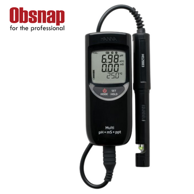 The HI991301 is a single probe that can measure temperature, conductivity (EC), pH, and total dissolved solids (TDS). Just two buttons are used to complete every operation, from setup to calibration. The meter has an IP 67 rating and is waterproof.